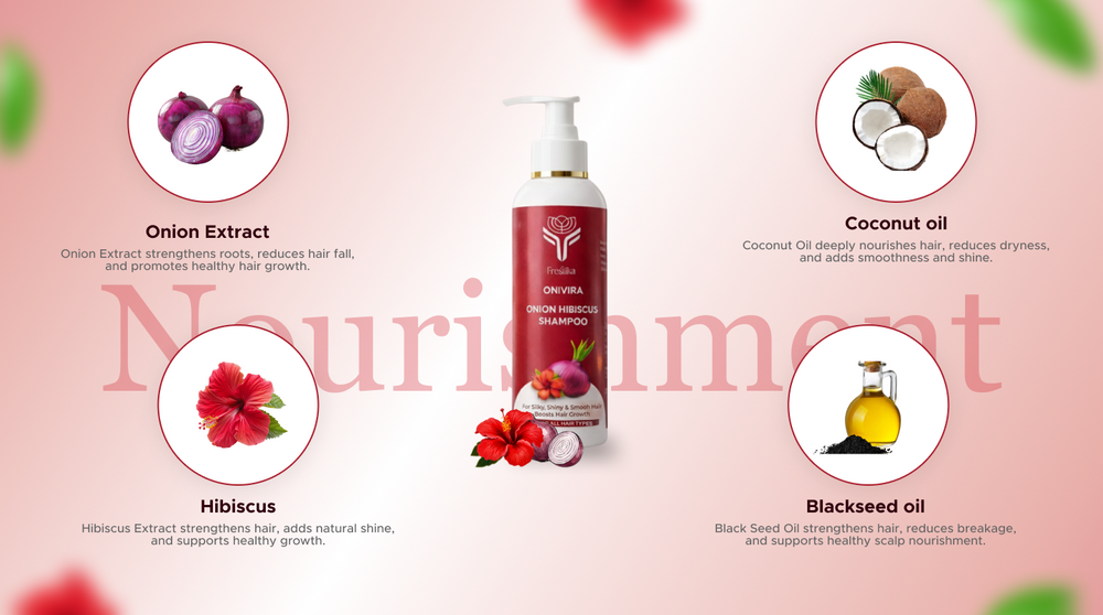 Give your hair the nourishment it deserves with Frestika Onion + Hibiscus Shampoo - a gentle yet powerful formula designed to promote healthy, smooth, and shiny hair.